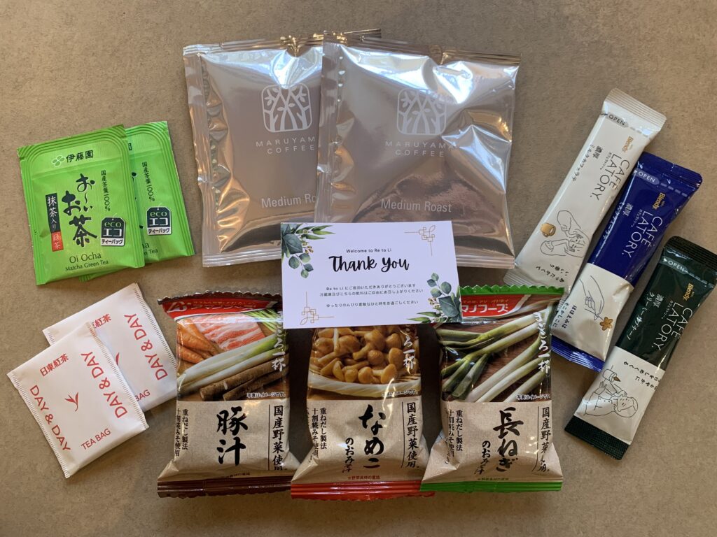 丸山珈琲のドリップバッグをはじめ、お味噌汁3種類や温かいお茶、紅茶なども取り揃えておりますので食事のあと1品!やほっと一息つきたいときにもおススメです👍